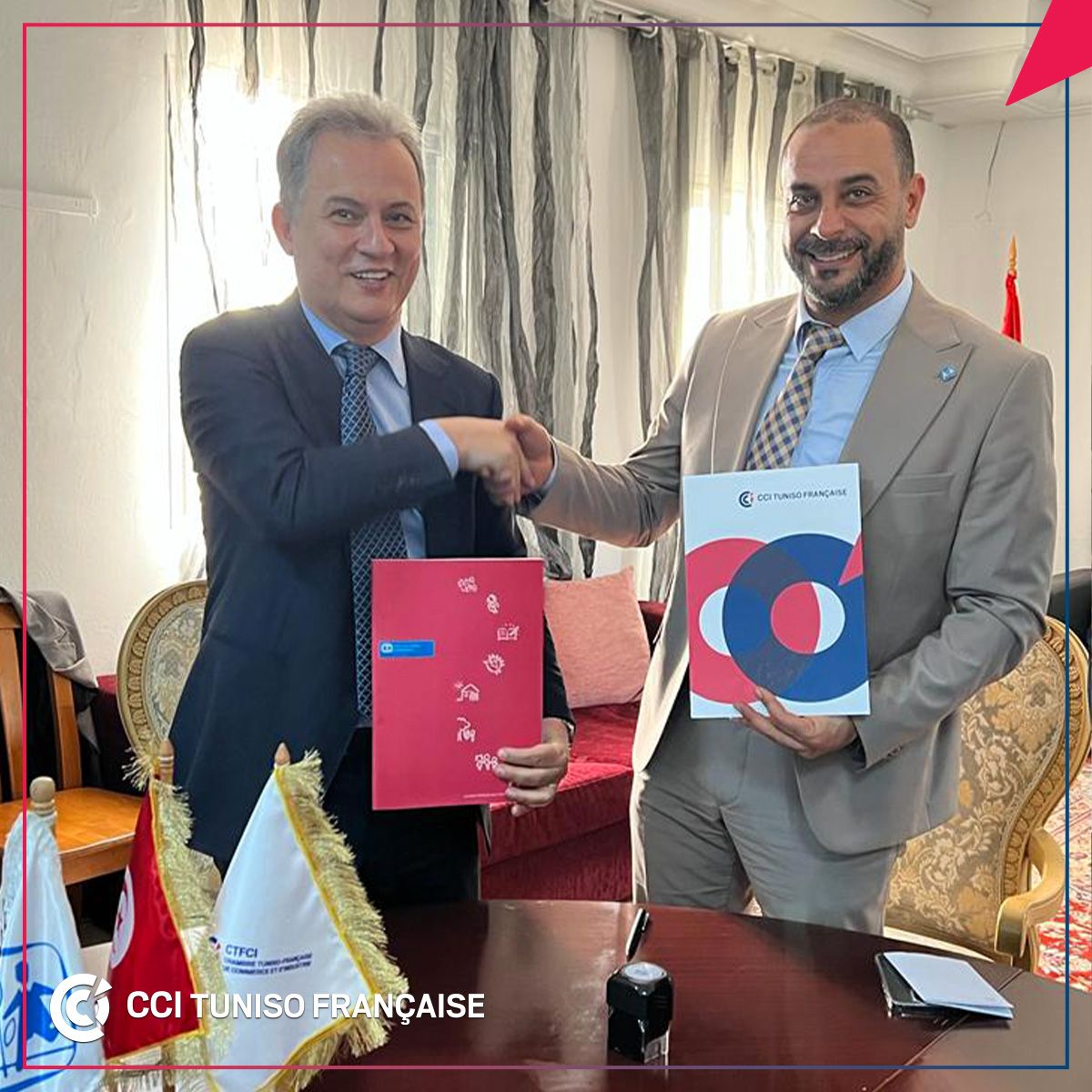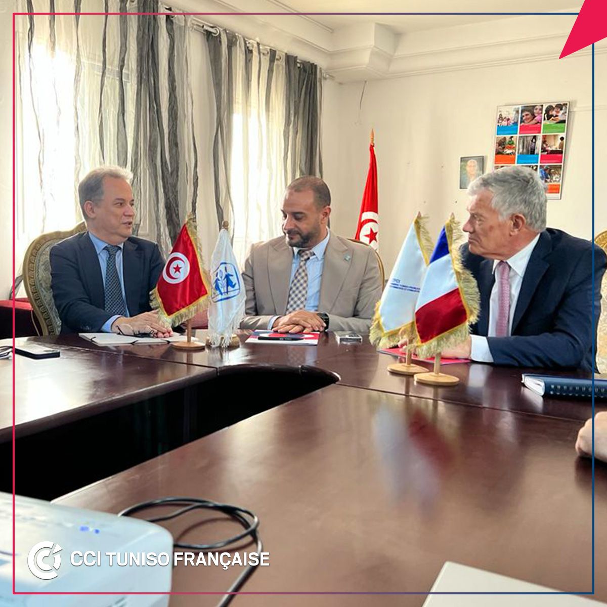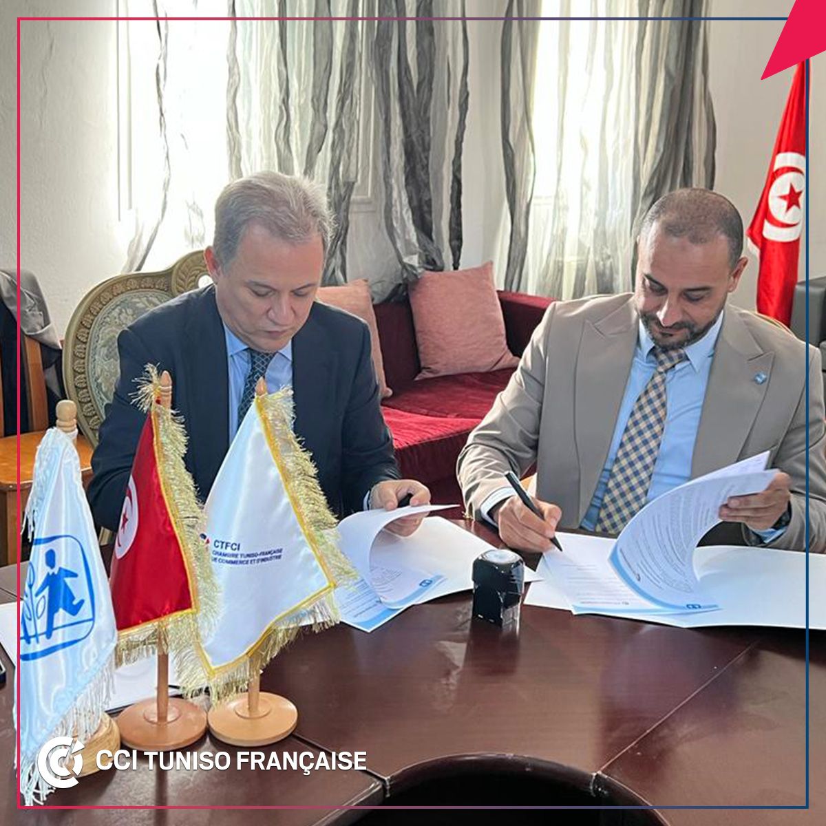 En présence de M. André_Parant, Ambassadeur de France en Tunisie, M. Khelil Chaibi, Président de la CCITF et Mohamed_Megdiche, Président de l’Association Tunisienne des villages d’enfants SOS_Gammarth, ATVESOS, ont signé, le vendredi 31 mars 2023, une convention de « parrainage familiale et de renforcement des relations ».